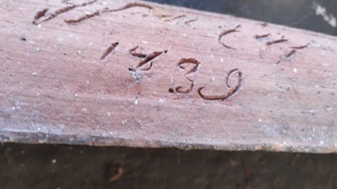 Unser Mitglied Heinz Neuthard aus Weiher besitzt so ein historisches Schätzchen bereits seit vielen Jahren. Als in den 90er Jahren des 20. Jahrhunderts die familieneigene Scheune in der Hauptstraße 144 abgebrochen wurde, fand sich ein komplett erhaltener Firstziegel mit dem eingeritzten Spruch: